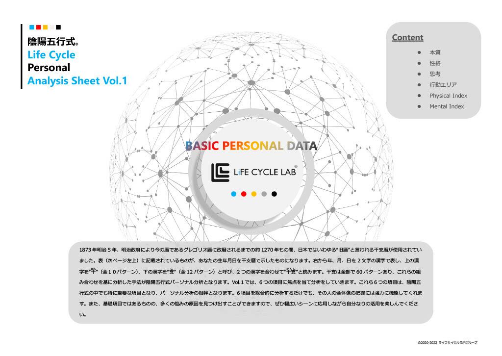 陰陽五行式におけるベーシックな分析項目でありながら、もっとも重要かつ分析の根幹を為す6項目を分析したパーソナル分析シートになります。