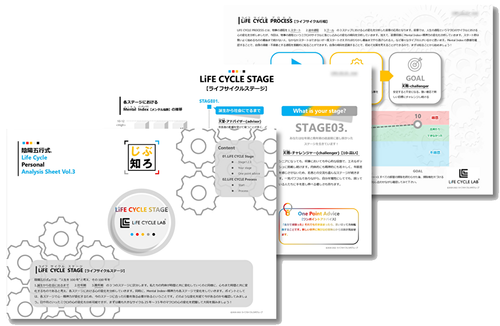 以上3つのSTAGEに区分します。私たちの肉体が時間と共に変化していくのと同様に、心もまた時間と共に変化するものであると考え、各ステージにおける心の変化を分析していきます。同時に、Mental Index(精神力)の変化についても分析していきます。